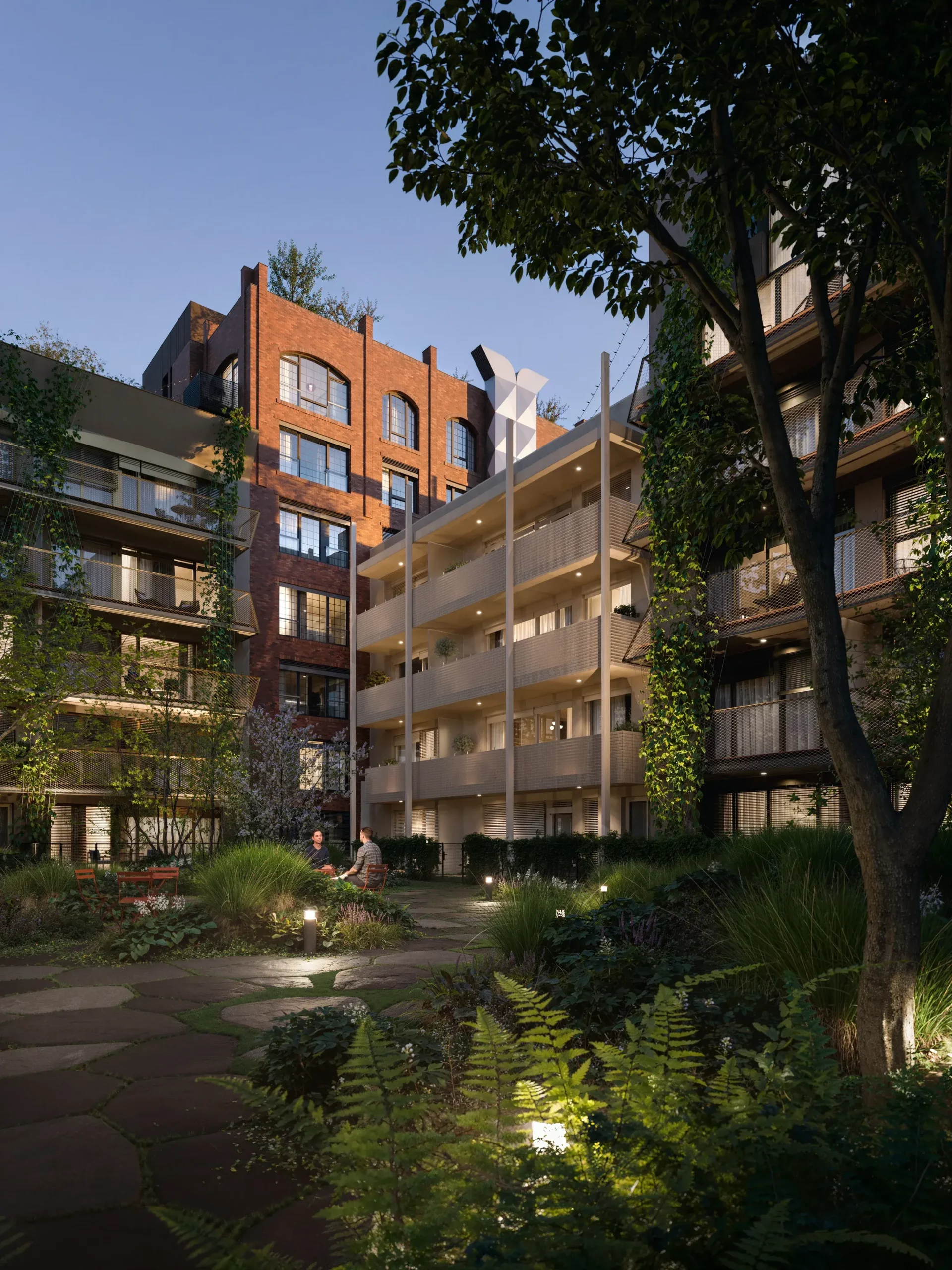 Byty jsou navrženy v širokém spektru dispozic od kompaktních 1+kk až po prostorné dvoupodlažní mezonety. Townhousy ve vnitřní zahradě nabízejí soukromé zahrádky a pocit rodinného bydlení uprostřed města. Součástí projektu je uzavřený zelený vnitroblok inspirovaný evropskými městskými dvory, střešní terasa s výhledy, sdílené komunitní prostory a dílna, stejně jako supermarket přímo v domě.