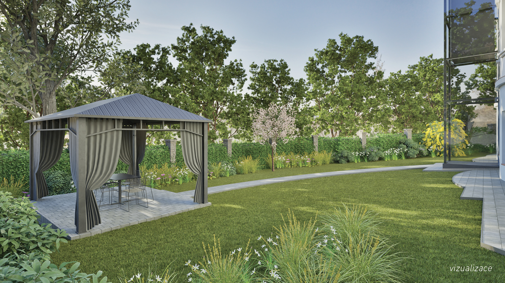 Významným benefitem projektu je rozlehlá společná zahrada určená k odpočinku a sousedskému setkávání, která bude nově upravena chodníky, pergolou a výsadbou zeleně.