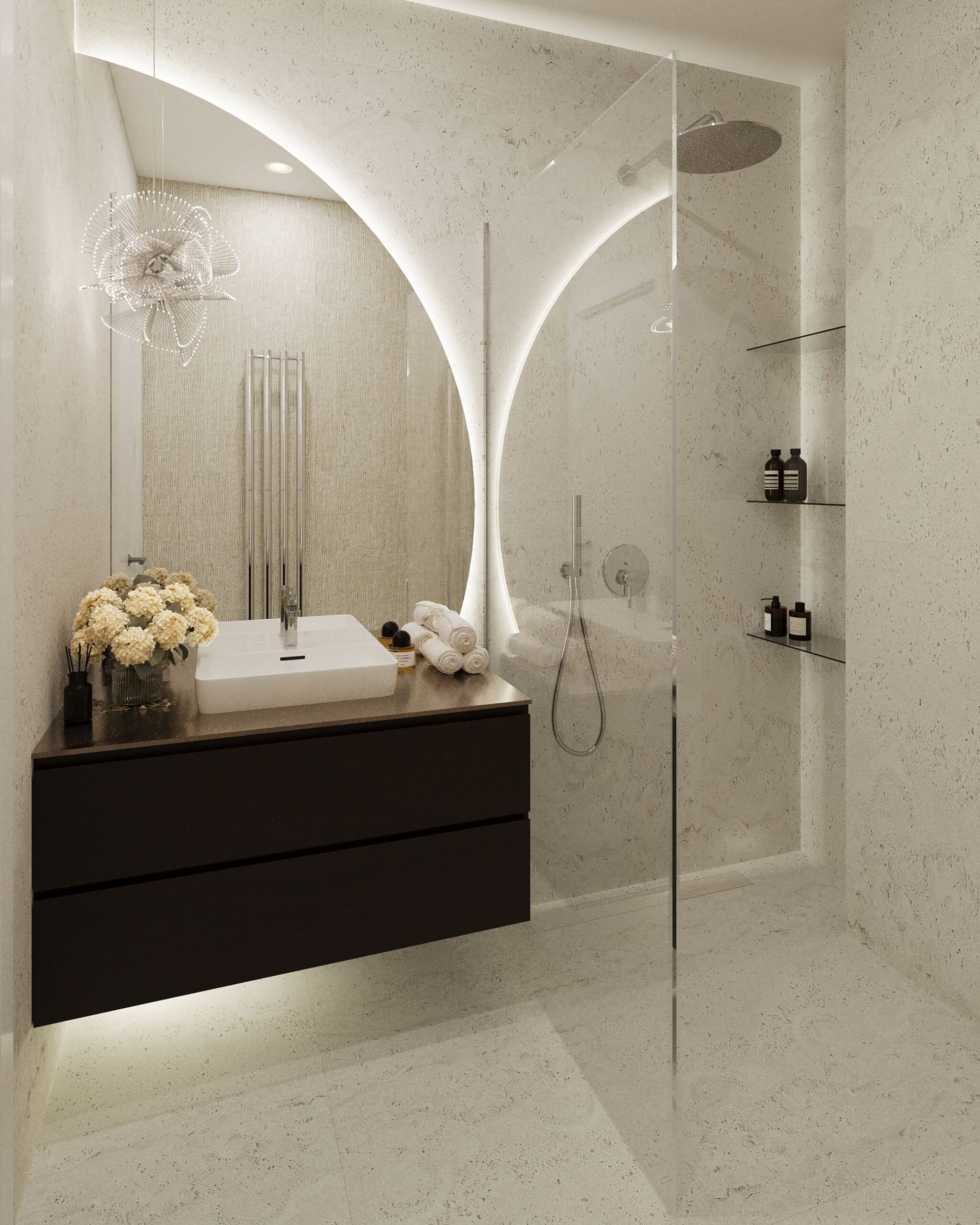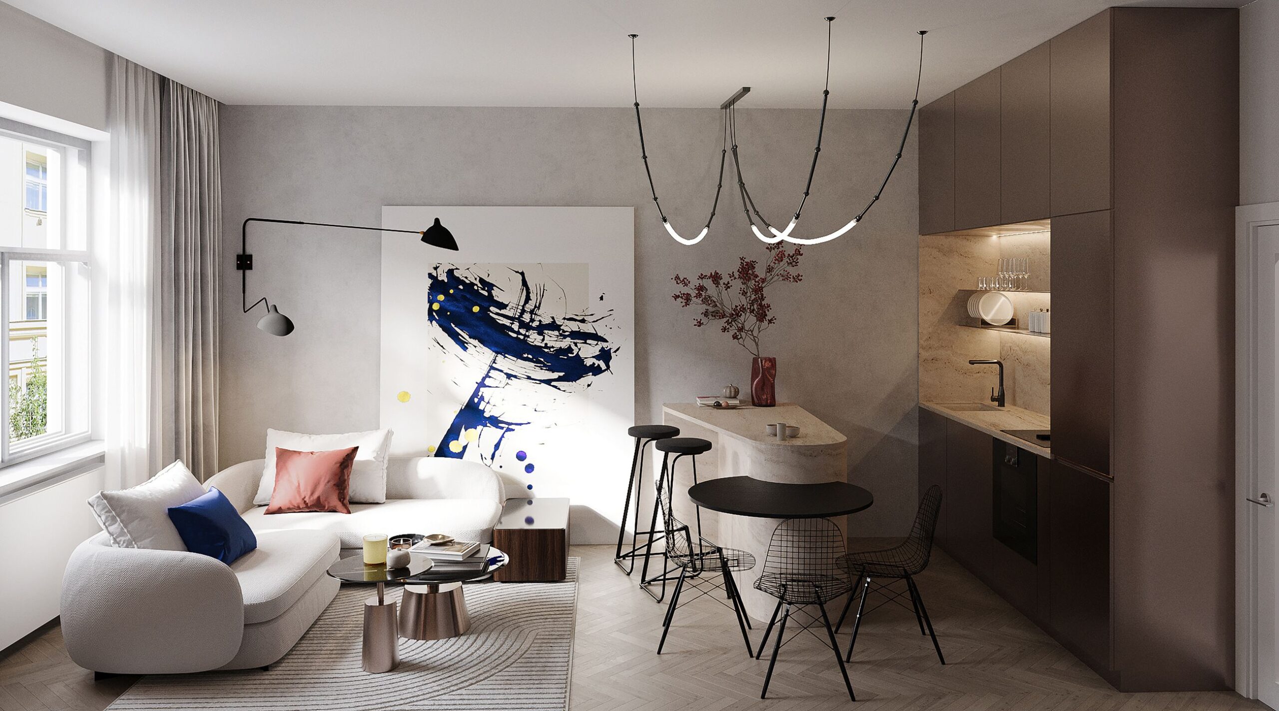Rekonstrukce zahrnuje osazení nových špaletových oken s izolačním dvojsklem, pokládku dubových parket v klasickém vzoru rybiny, výrobu bezfalcových interiérových dveří na míru a koupelny vybavené velkoformátovou dlažbou a obklady v decentních barvách. Společné prostory procházejí rozsáhlou obnovou od sklepa po půdu, včetně instalace nového výtahu, výměny stoupaček, renovace chodeb a montáže bezpečnostních vstupních dveří.