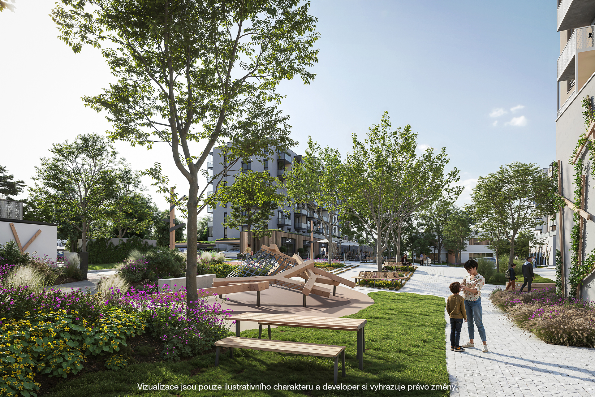 Součástí bude také mateřská škola pro čtyři třídy, navržená jako moderní dřevostavba. Parkování bude řešeno v rámci areálu a celý koncept je doplněn o promyšlený systém modrozelené infrastruktury, který umožní efektivní hospodaření s dešťovou vodou prostřednictvím retenčních prvků, propustných povrchů a akumulačních nádrží. Charakteristickým prvkem projektu bude také vodní prvek v podobě jezírka na centrálním náměstí.