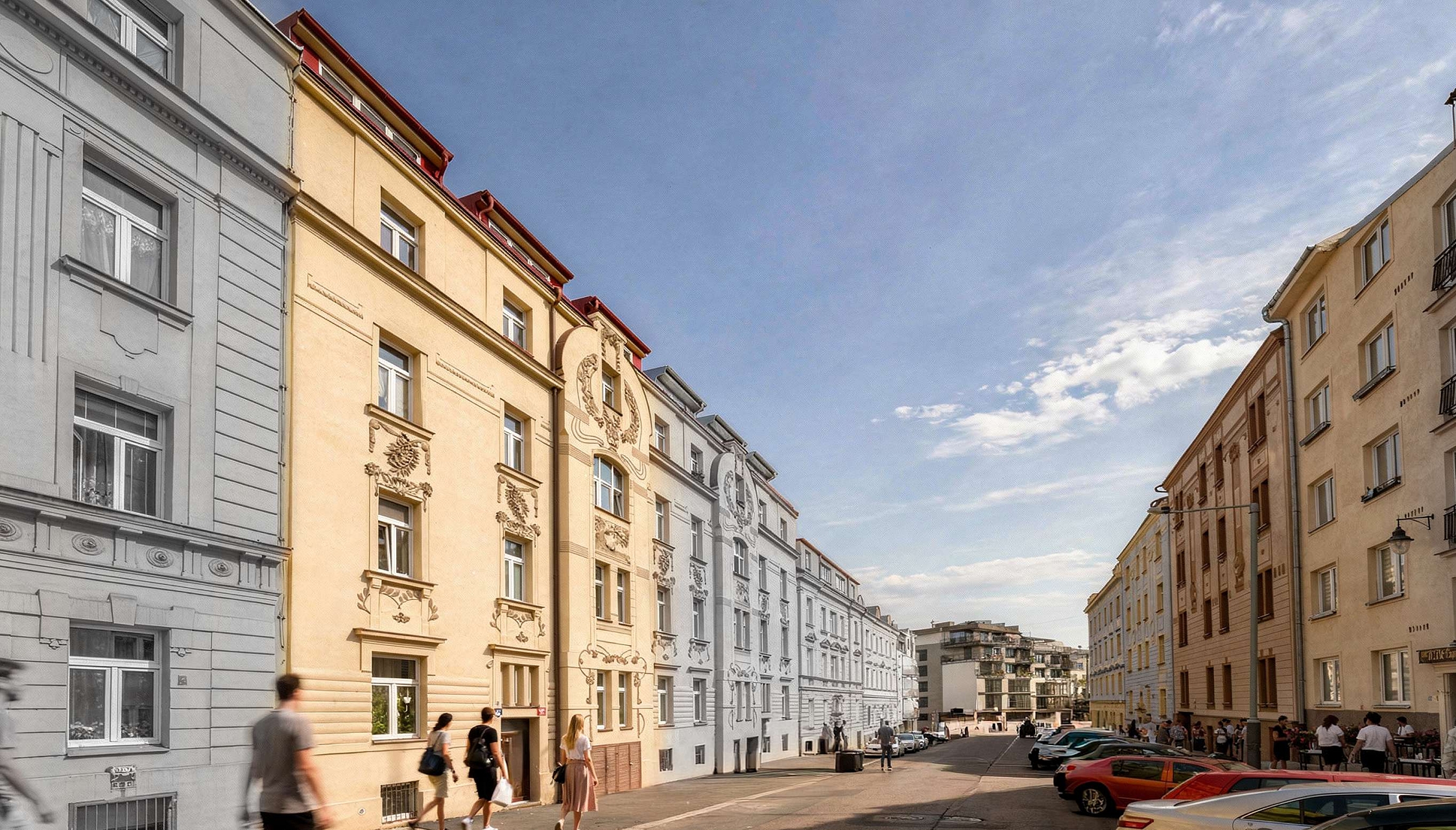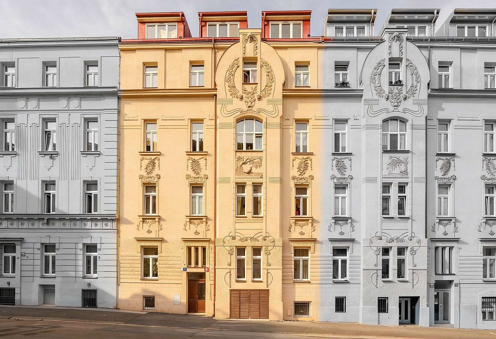 Společné prostory procházejí luxusní rekonstrukcí ve vysokém standardu a vytvářejí reprezentativní vstup do domu díky designovému osvětlení, benátskému štuku a dalším elegantním prvkům. Obnovená fasáda s původními secesními ornamenty podtrhuje historickou hodnotu domu a dodává projektu jedinečný architektonický charakter.